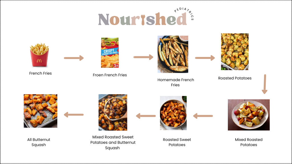 One strategy that I often recommend parents try is called food chaining. Food chaining is a gentle, evidence-based way to help kids more from familiar foods to new, nutrient dense food without the pressure or tears. It can help their nervous system feel safe because instead of trying an entirely new food, we can decrease the change/stimuli by changing one thing at a time. It’s similar to the game “telephone”! We start with a preferred food and change the properties one at a time until the end result is something totally new.